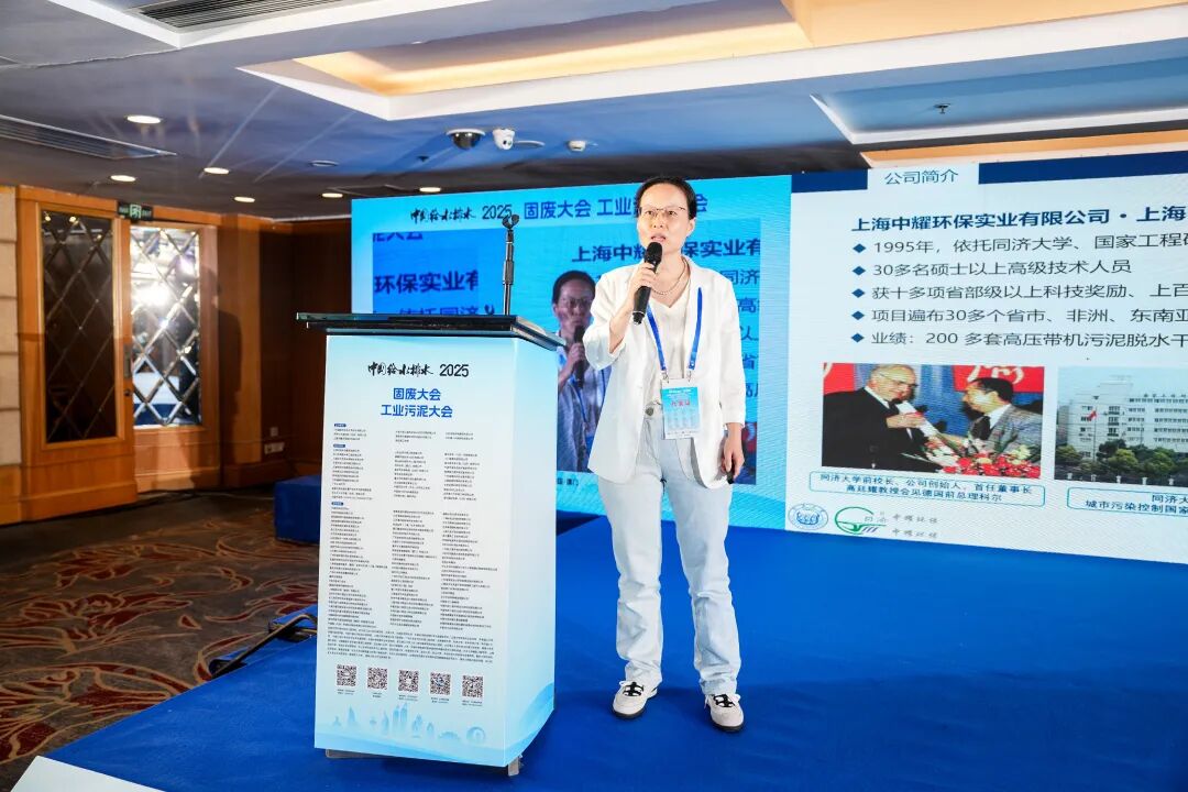 中耀环保研究院院长/申耀环保副总经理阮燕霞高级工程师在城镇污泥处理研讨会主会场上做了主题为《“同济”牌高压带机及其低碳高干工艺应用于污泥减量和降碳增效的十四年创新与实践》的精彩报告。中耀环保副总经理/申耀环保总经理唐秀华高级工程师在固废及工业污泥大会上做了主题为《同济牌“高压带机在农牧固废及工业污泥领域中的创新与实践》精彩分享。