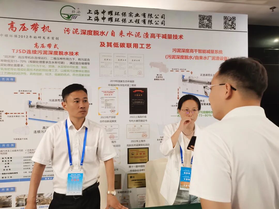 在双碳战略下,“同济”牌高压带机技术设备及其低碳创新工艺在市政污泥、自来水厂泥渣、工业污泥、农牧固废等领域的减污降碳、协同增效高干减量处理及资源化处理处置中具有独特优势和特点以及竞争力!针对上述需求、泥质物料特性及现状,中耀环保推出了高压带机及超高压带机与低温干化、好氧堆肥、电厂掺烧、污泥自持焚烧等联用创新工艺技术,可一步到位,实现污泥的脱水及烘干、掺烧、污泥自持焚烧或农牧固废的资源化利用等,更好地为后续污泥的出路做好铺垫,实现污泥的综合有效处置或资源化利用。截止目前,中耀环保高压带机设备在污水厂泥渣减量和降碳增效工程应用中的案例达250多个,设备套数400多套。按含水率80%计,其中市政污水厂污泥处理规模达7000多吨、工业污泥1500多吨、自来水厂污泥300多吨,粪便类污泥1800多吨。中耀环保在高压带机污泥深度脱水领域的创新技术装备和推广应用成果受到大会的广泛关注,反响热烈!